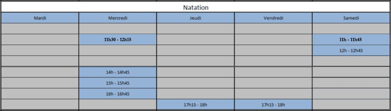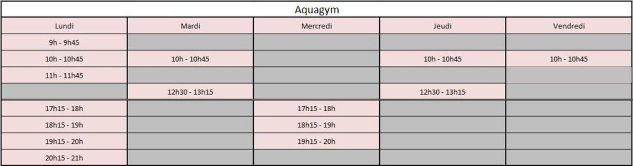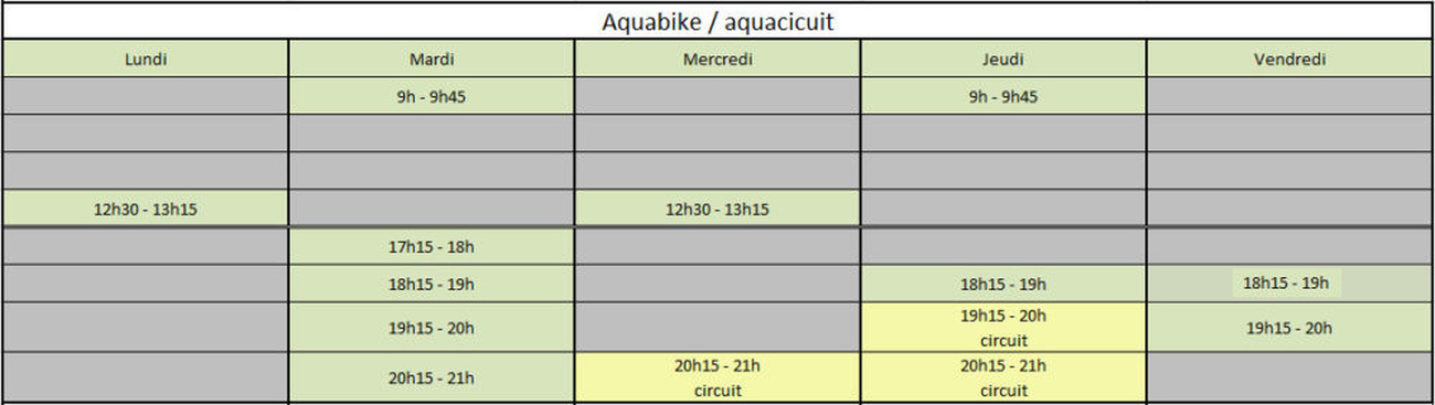 Voici le planning des différentes activités (aquagym, aquabike, aquacircuit, bébés nageurs et natation).